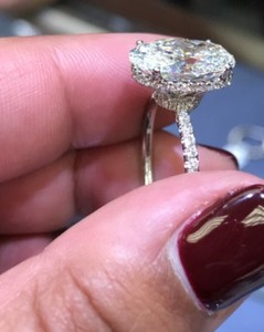 Available in 18k white gold. Victoria's secret model devon windsor's engagement ring from ring concierge includes an oval stone atop a hidden halo setting. Oval diamond center the center of this ring is a 1.20 carat oval diamond. Show her how you feel with this elegant d vs2 oval featuring the hidden halo design. Pair a secret halo with a diamond accented band for an utterly dazzling look.